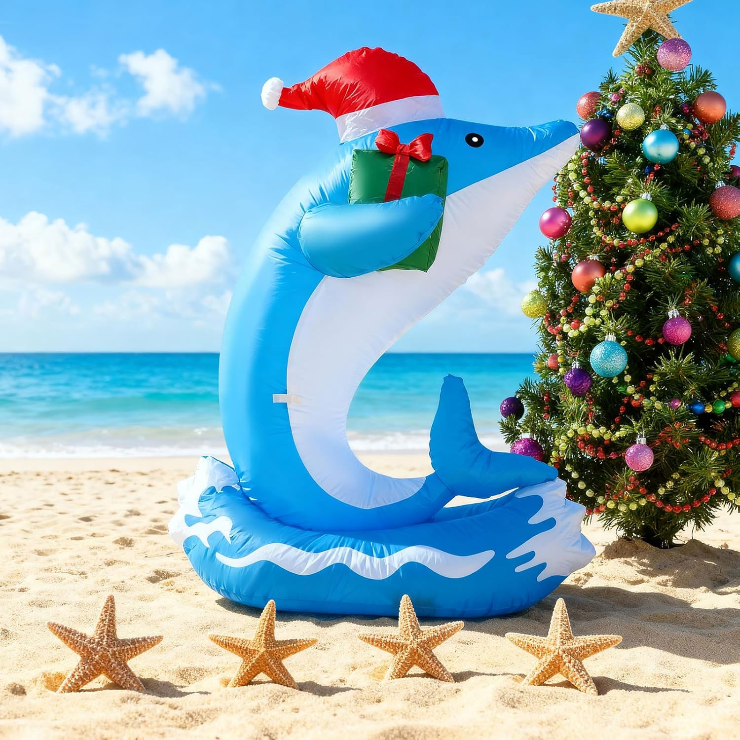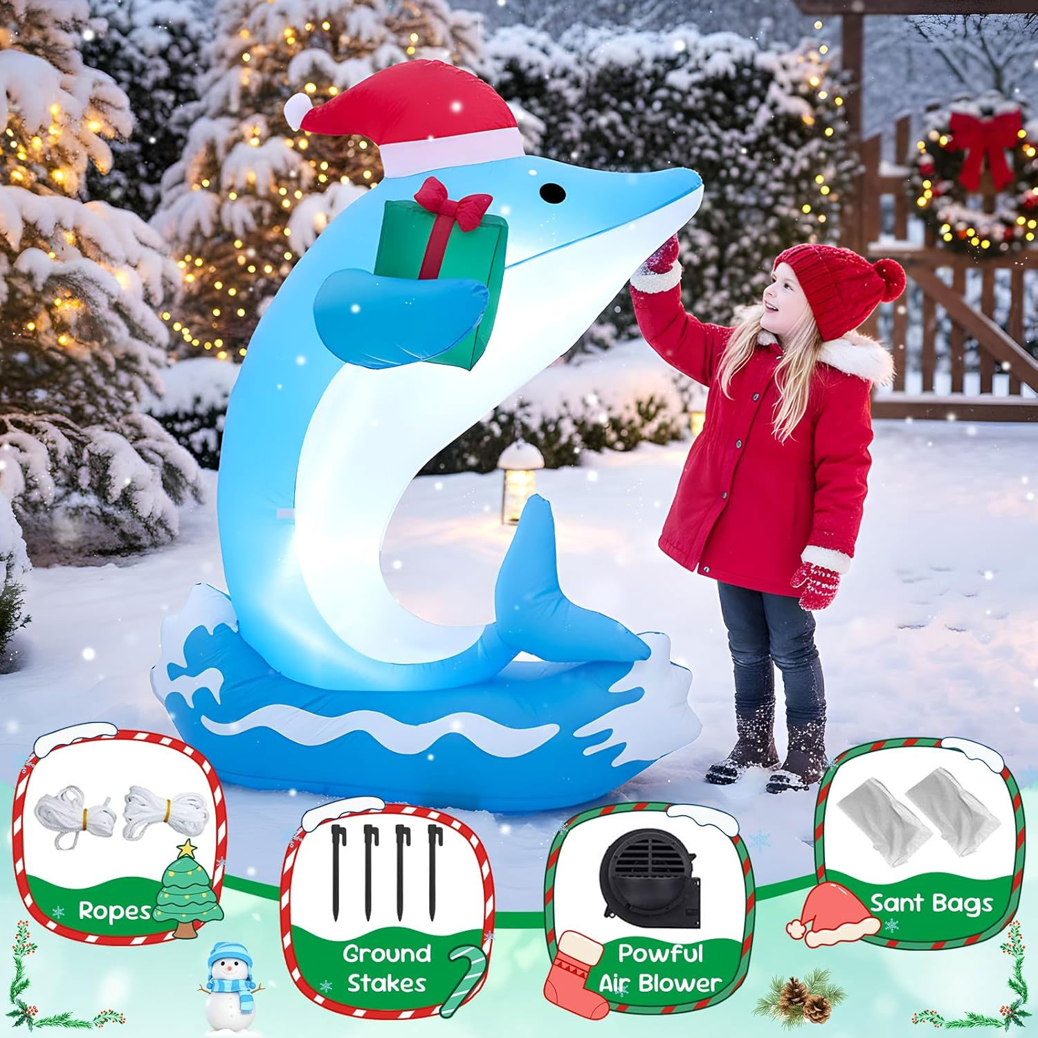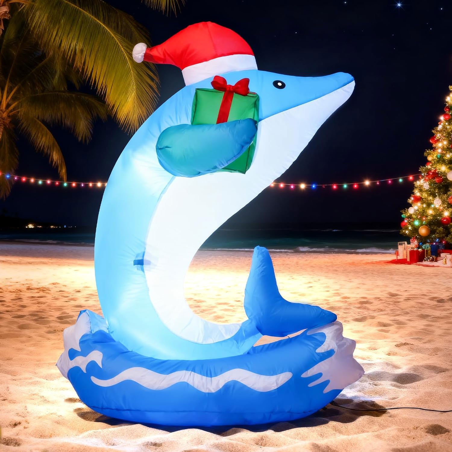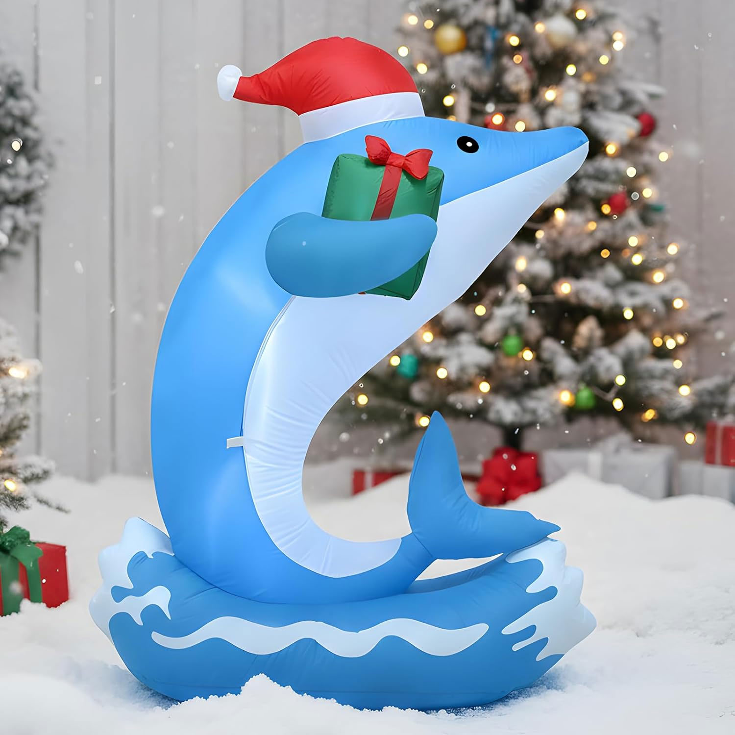 Add a fun coastal twist to your Christmas décor with this charming 1.2m Blue Dolphin with Gift Christmas Inflatable. Featuring a bright blue dolphin wearing a festive Santa hat and proudly holding a wrapped present, this playful inflatable brings a cheerful and unique touch to any Christmas display.