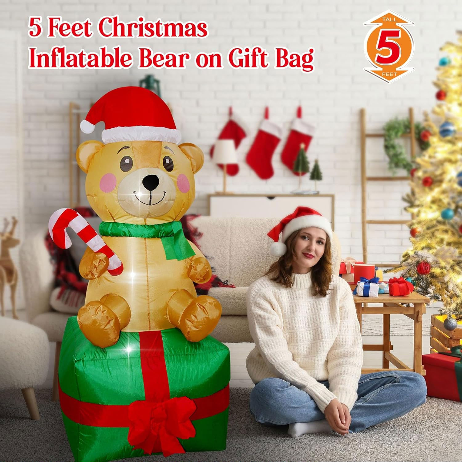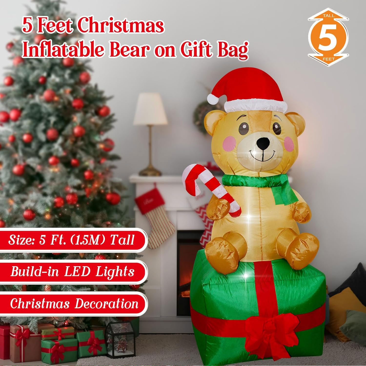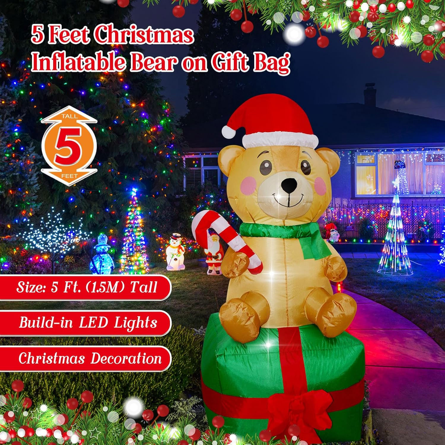 With its warm built-in LED lighting, this cheerful bear creates a welcoming festive glow that looks great both day and night, making it perfect for front yards, gardens, shopfronts, or indoor displays.