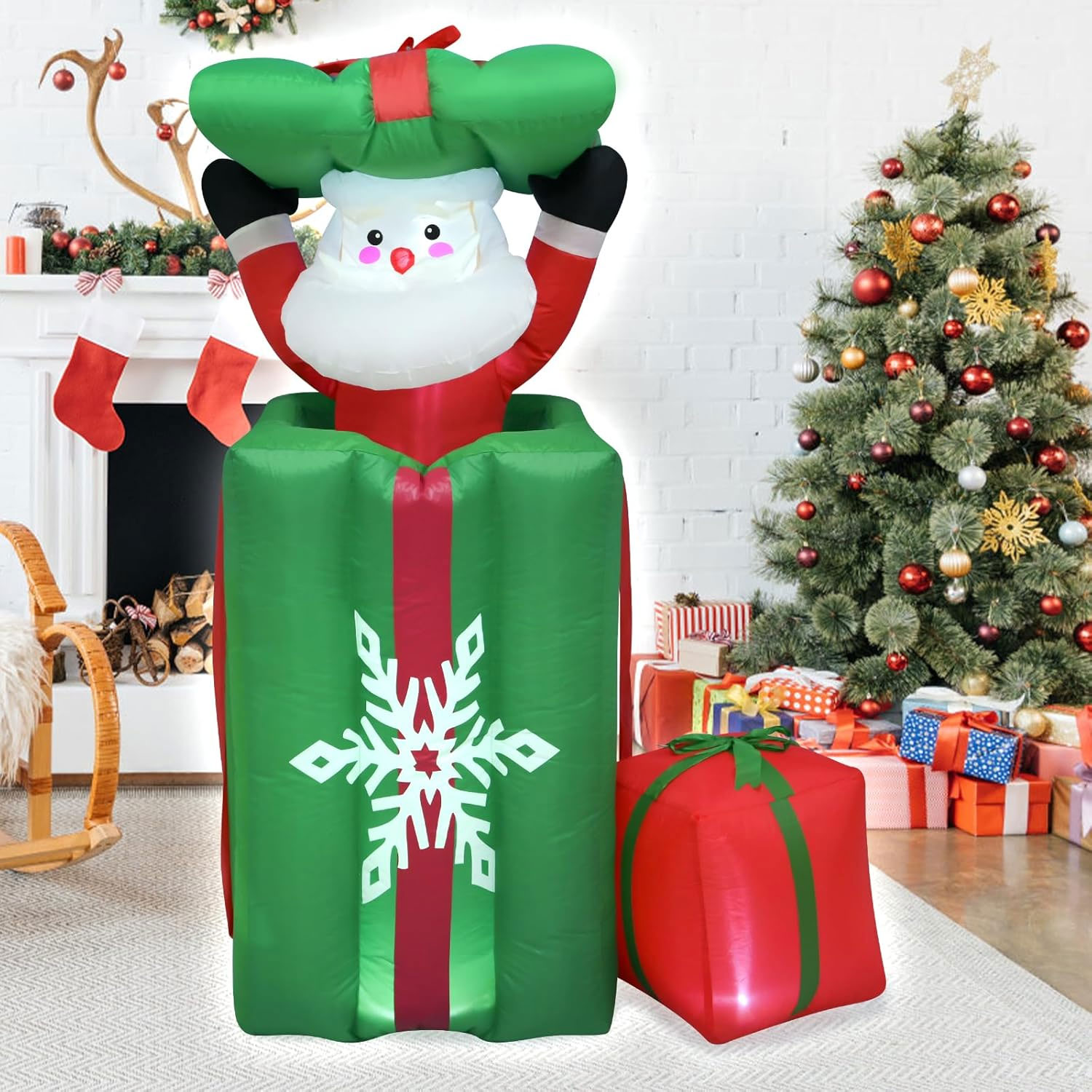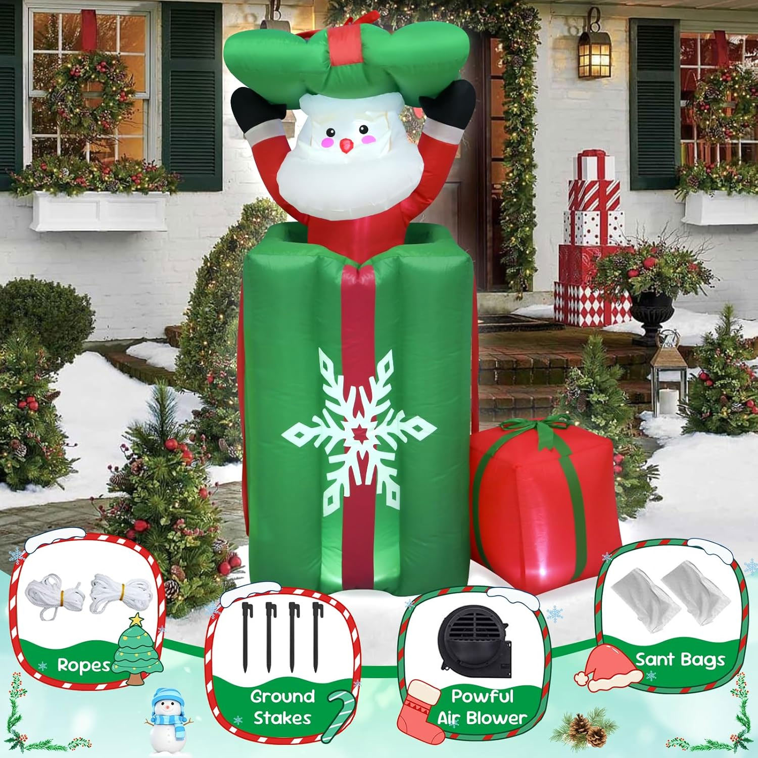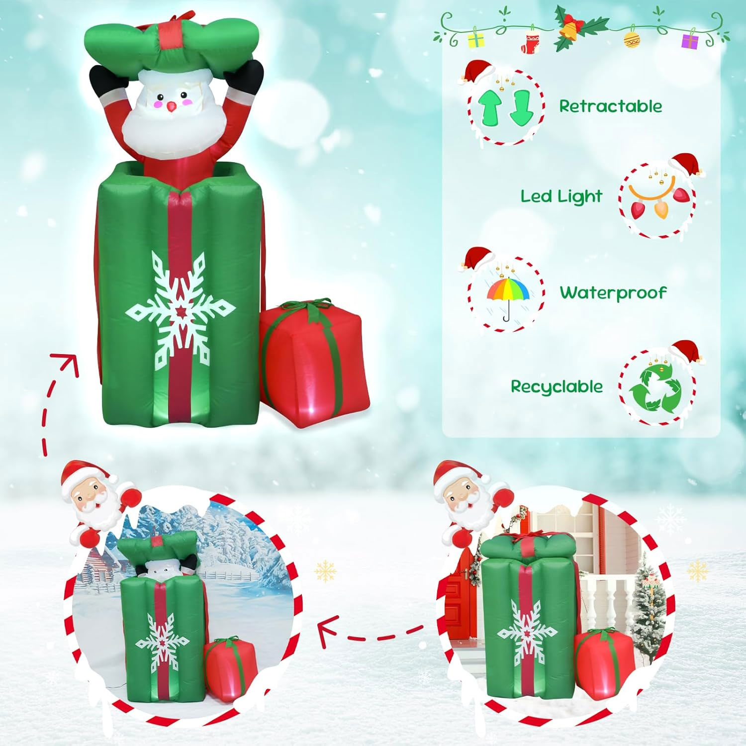 Surprise and delight your visitors with this fun and interactive 1.5m Green Gift Santa Popup Animated Christmas Inflatable. Designed to look like a giant green present with festive snowflake detailing, this inflatable features Santa popping up from inside the gift, creating a playful animated effect that brings your Christmas display to life.