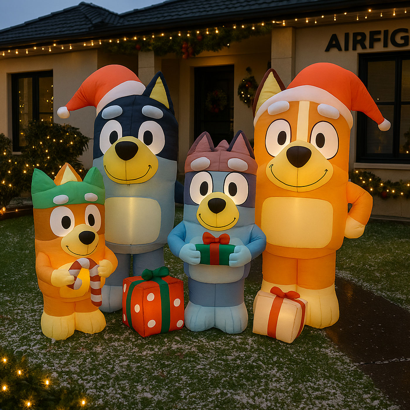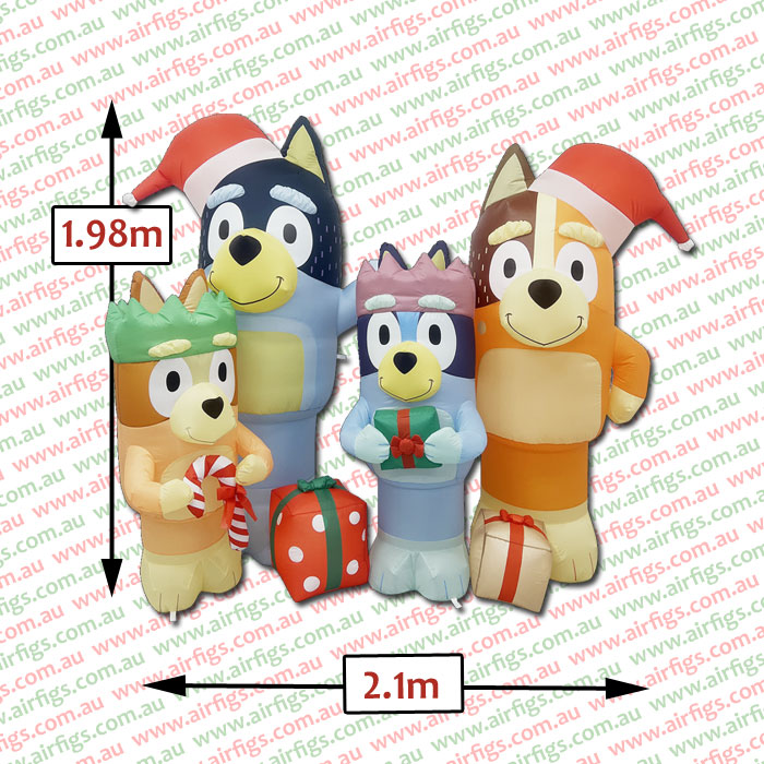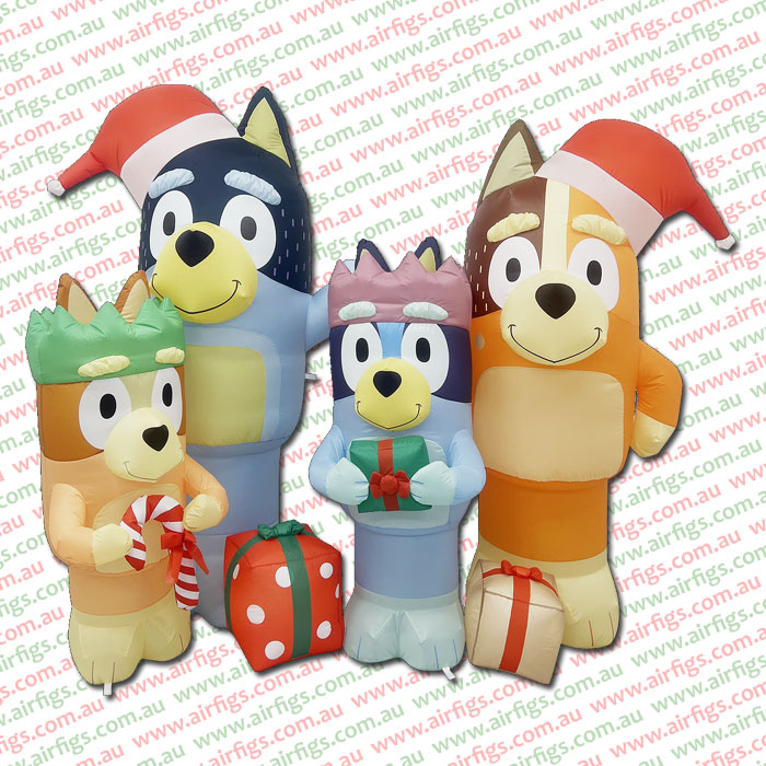 Each character holds festive accessories — from candy canes to wrapped gifts — while Bluey and Bandit sport Santa hats, adding that perfect Aussie family touch to your outdoor décor.