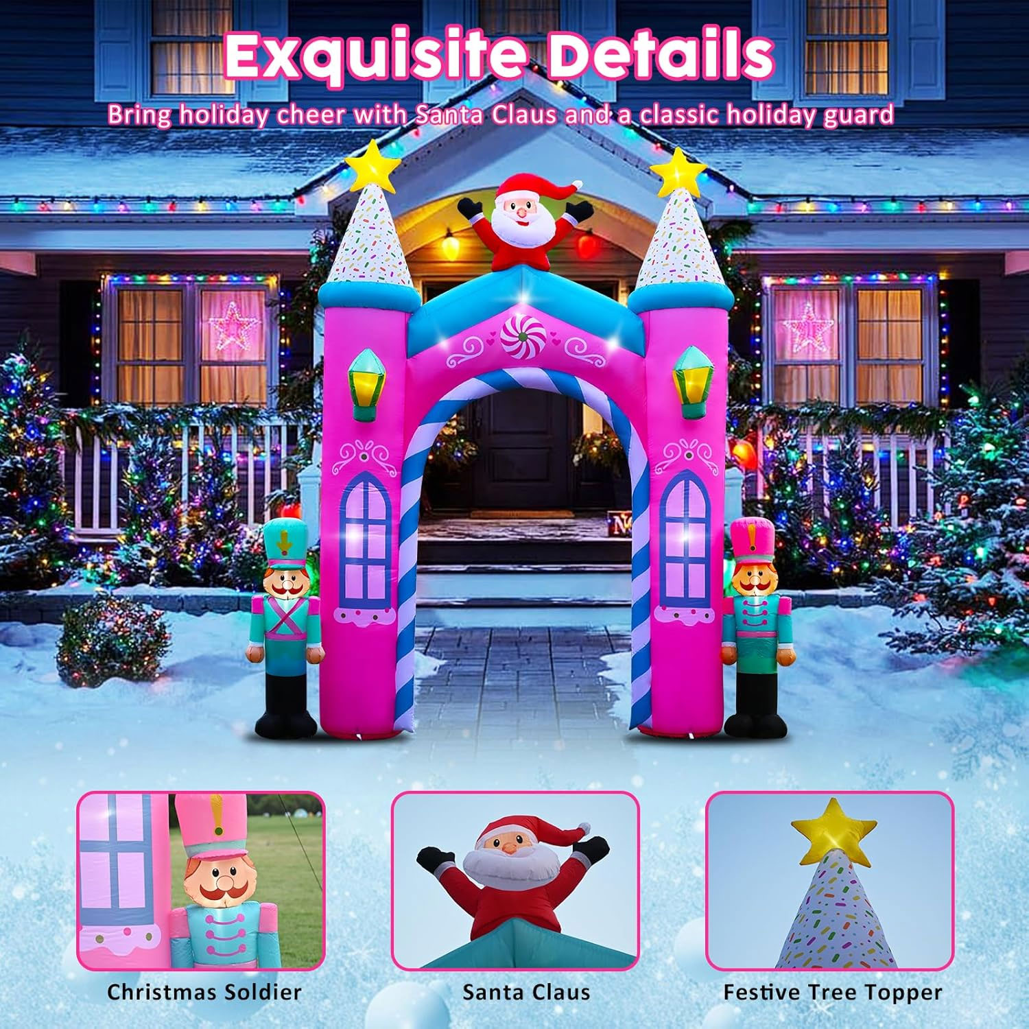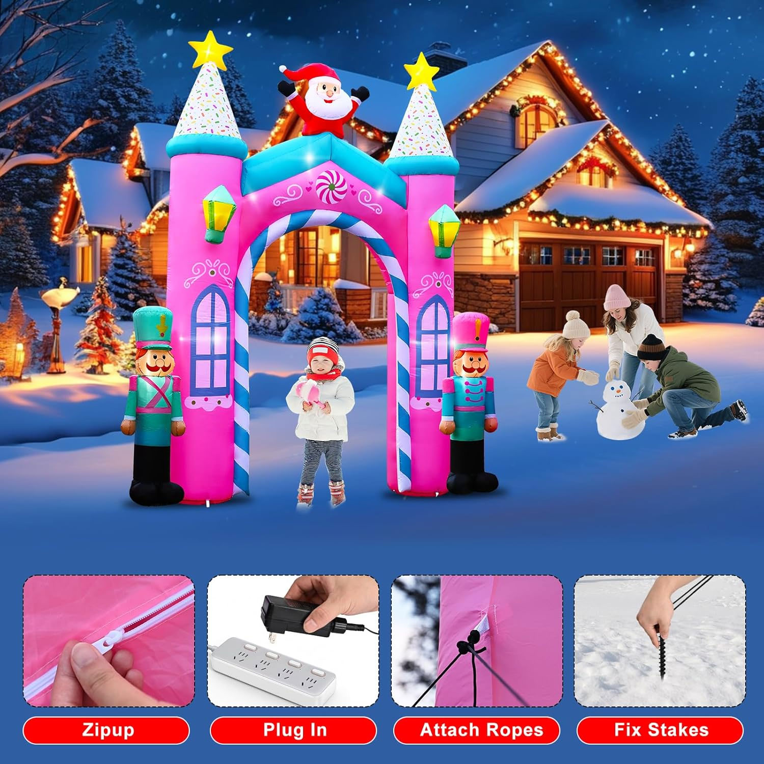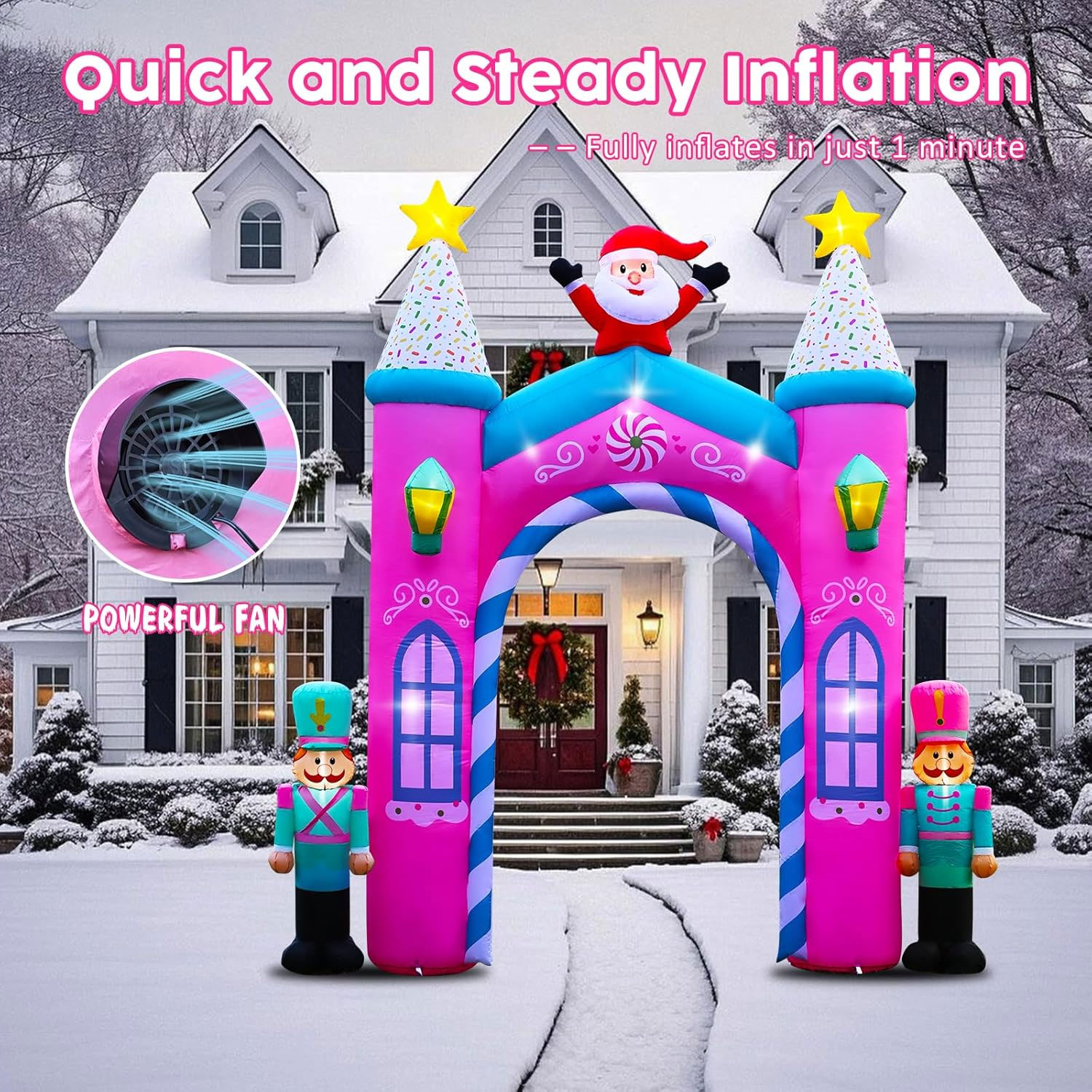 Styled in vibrant pinks and candy-inspired details, this inflatable archway instantly transforms your space into a cheerful Christmas wonderland. The arched entryway creates a welcoming gateway for guests, children, and festive photos, while Santa and the nutcracker soldiers add classic Christmas charm.
