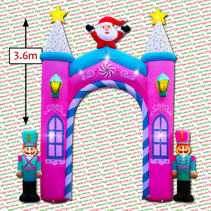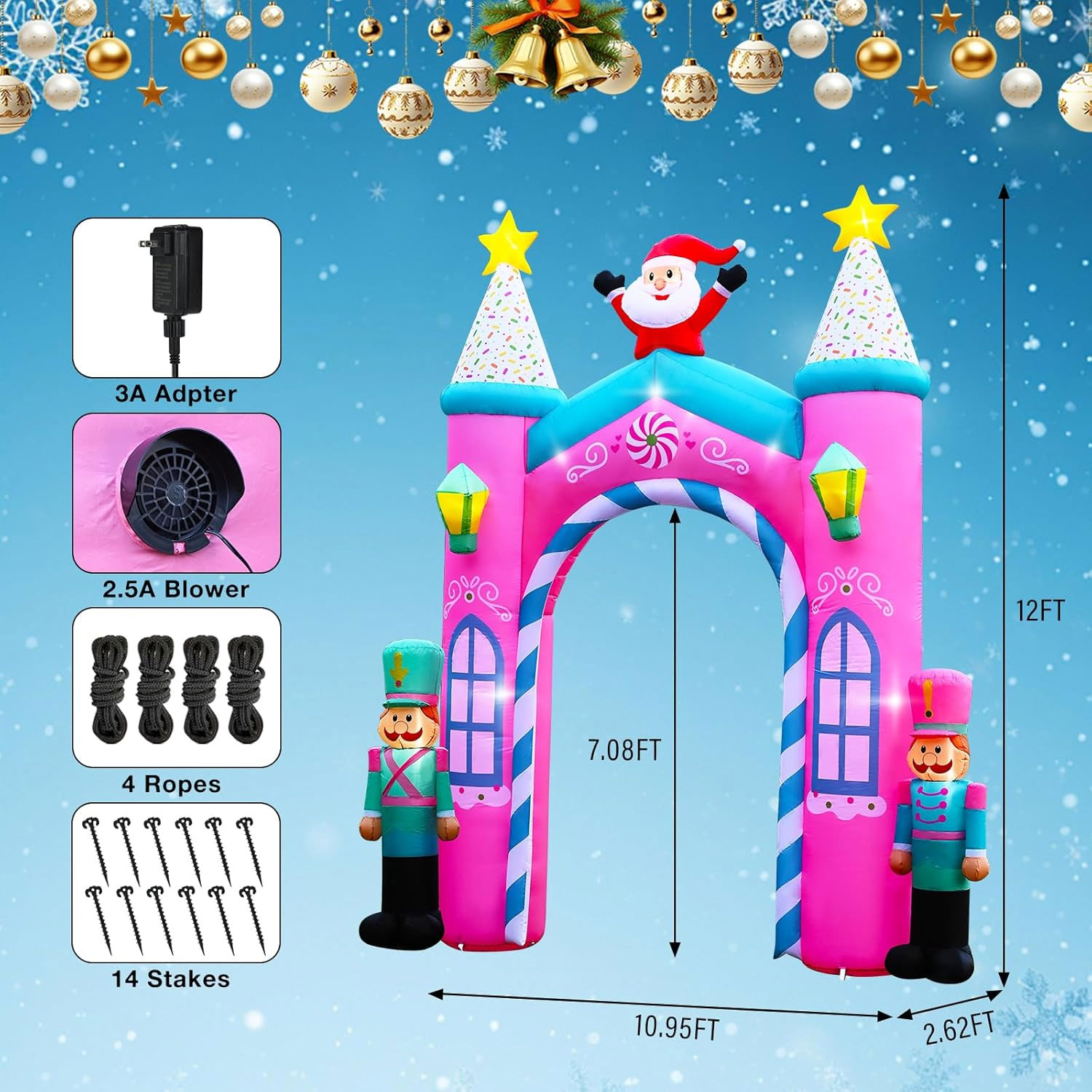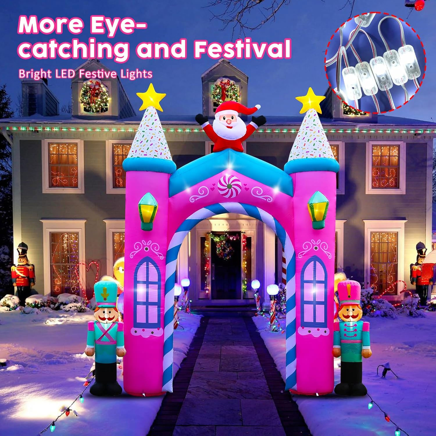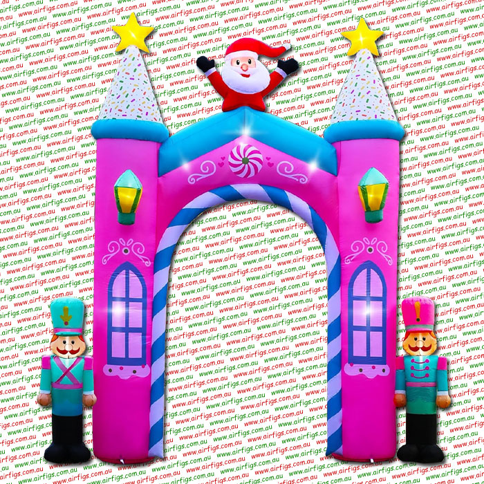 Styled in vibrant pinks and candy-inspired details, this inflatable archway instantly transforms your space into a cheerful Christmas wonderland. The arched entryway creates a welcoming gateway for guests, children, and festive photos, while Santa and the nutcracker soldiers add classic Christmas charm.